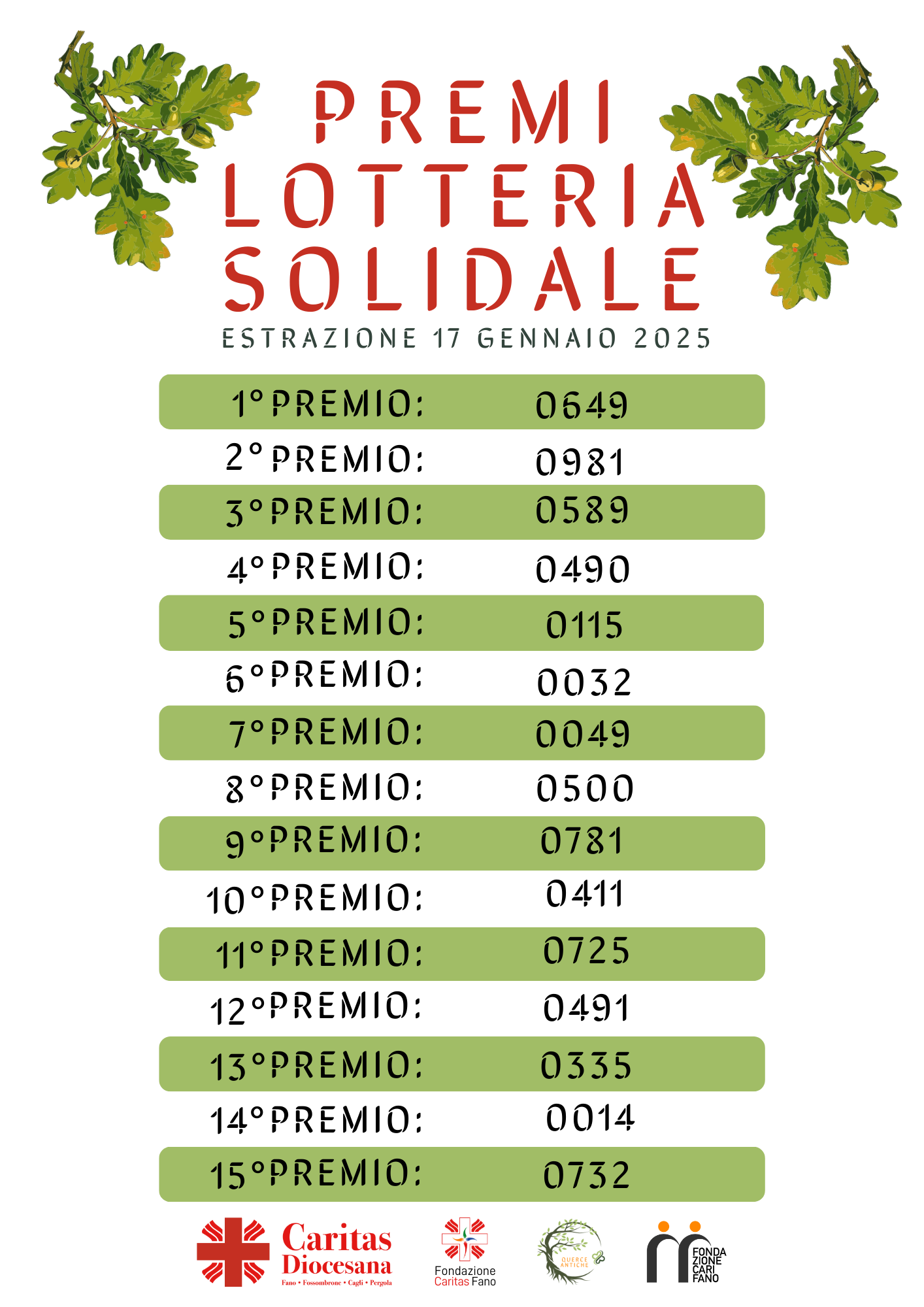 Published in: Uncategorized Biglietti vincenti lotteria solidale Ecco i biglietti vincenti della lotteria solidale:1° premio: 06492° premio: 09813° premio: 05894° premio: 04905° premio: 01156° premio: 00327° premio: 00498° premio: 05009° premio: 078110° premio: 041111° premio: 072512° premio: 049113° premio: 033514° premio: 001415° premio: 0732 Per ritirare il tuo premio contattaci al 3770950007Grazie a tutti i partecipanti che hanno sostenuto il progetto “Querce Antiche“!