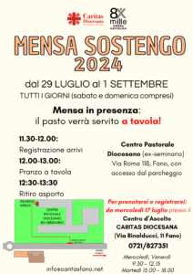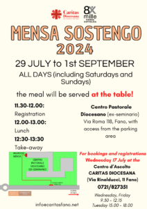Torna anche quest’anno la Mensa SOStengo, attiva nel mese di agosto, presso il centro Pastorale Diocesano a Fano in via Roma 118, da lunedì 29 luglio a domenica 1° settembre, per prendersi cura durante l’estate di quanti sono in difficoltà.